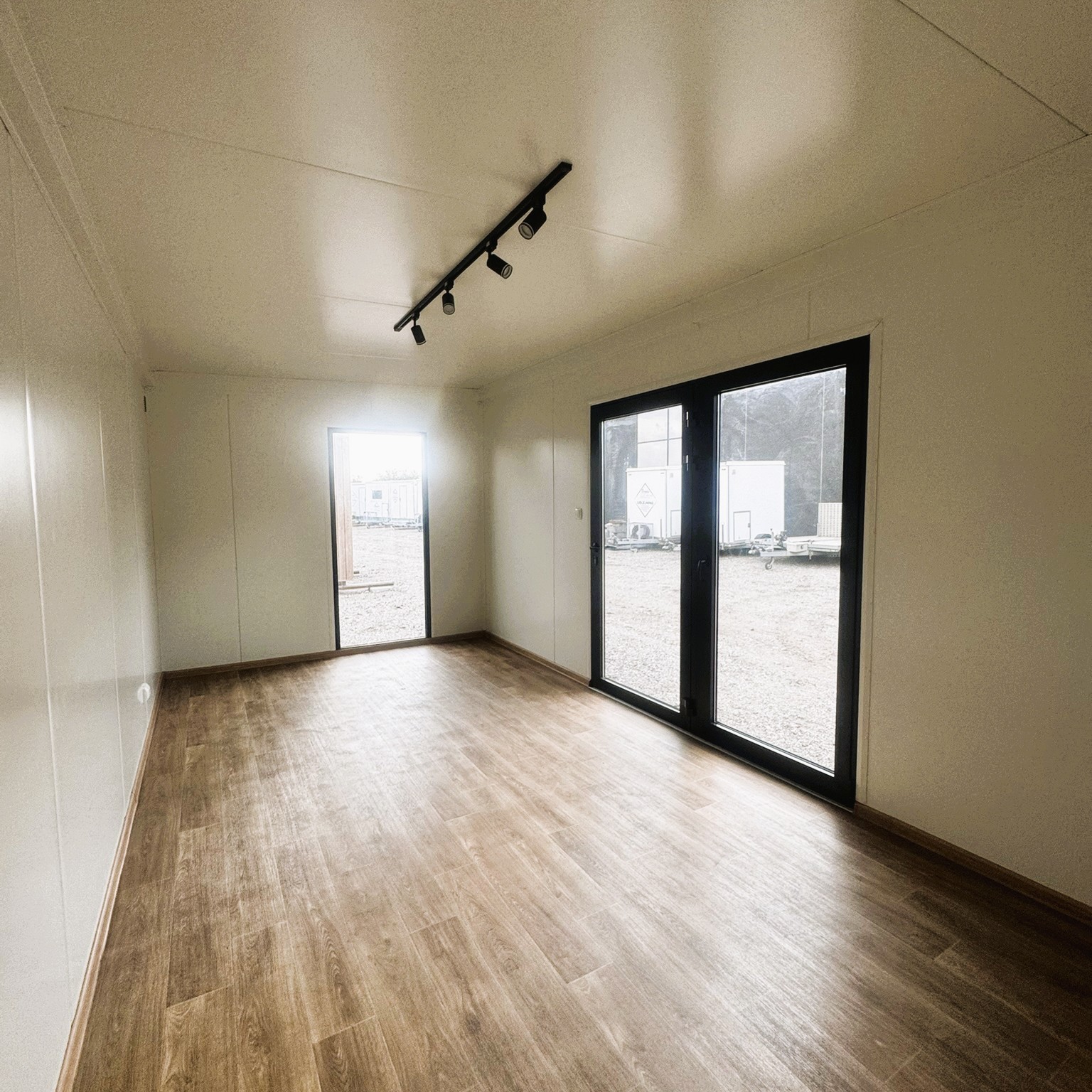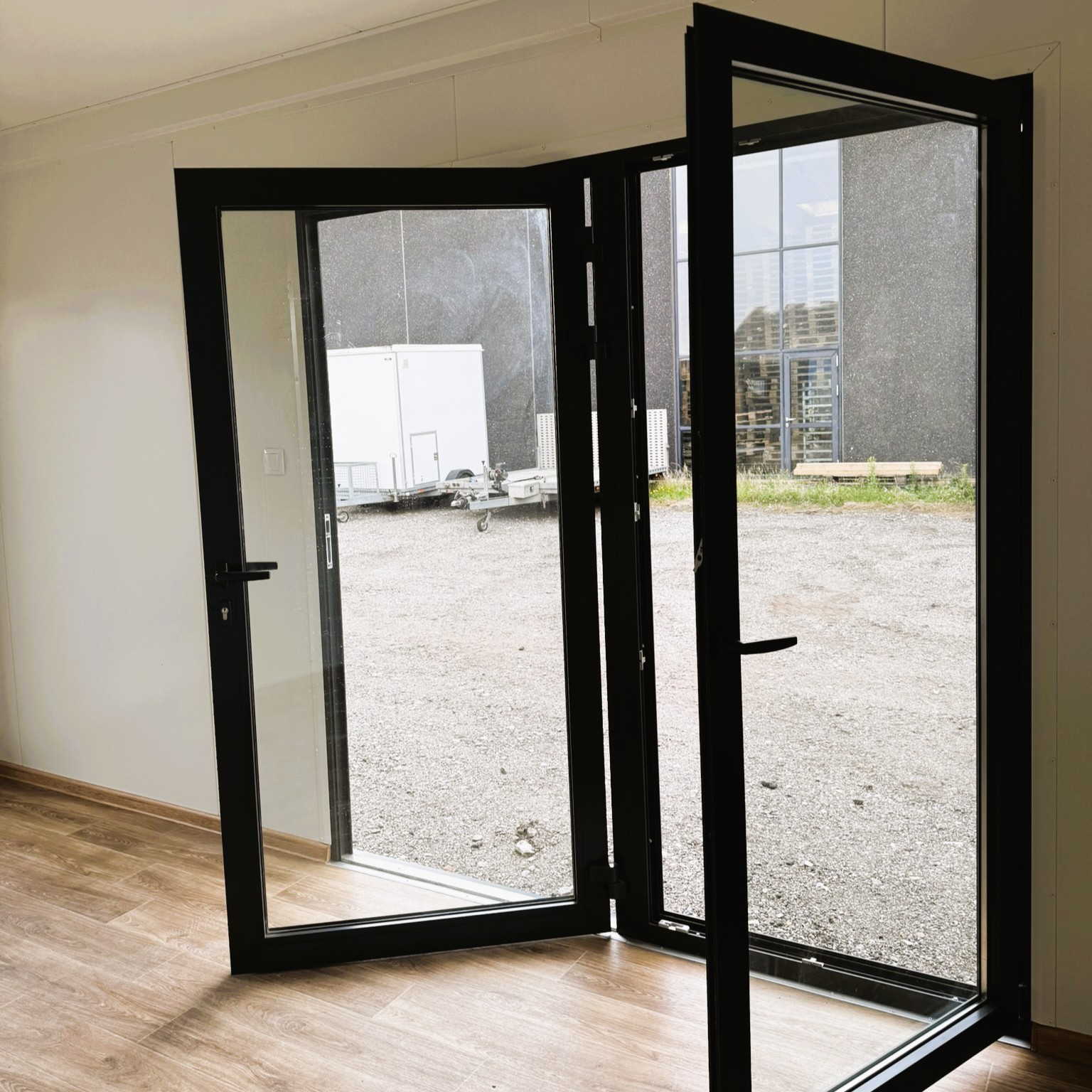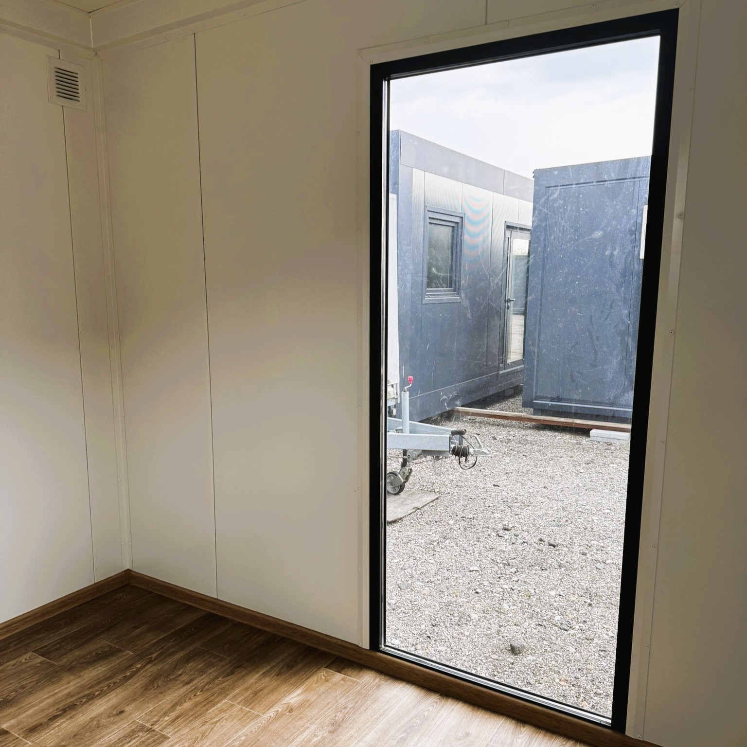 Uanset om pavillonen skal placeres i haven, ved virksomheden eller et helt tredje sted, vil dens rene linjer og tidløse design sikre et harmonisk samspil med omgivelserne. Store panoramavinduer og en glasdør i aluminium lukker dagslyset ind og skaber en lys og luftig atmosfære indenfor – ideelt til både arbejds- og opholdsrum.