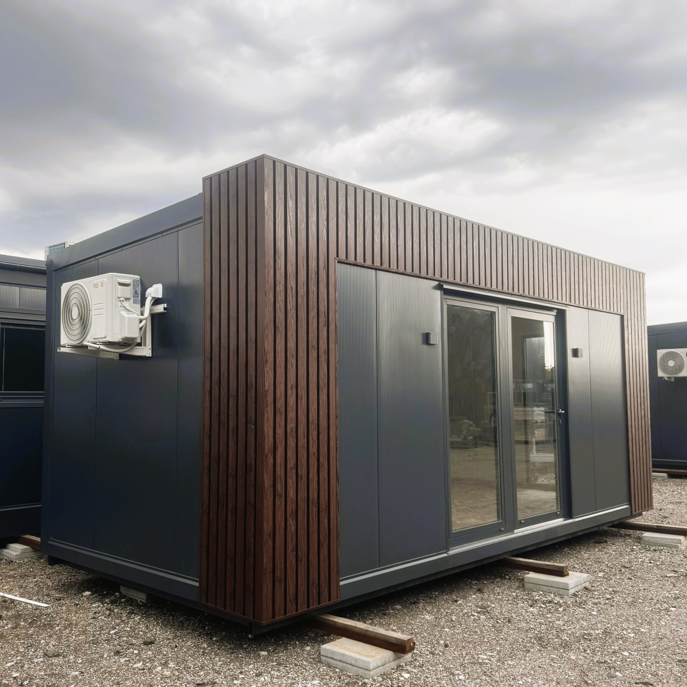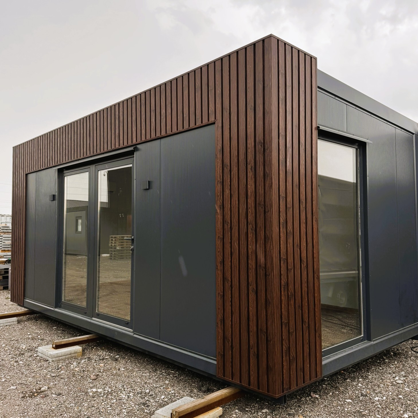 Vores 6×3 meter pavillon forener moderne æstetik og praktisk funktionalitet i én komplet løsning. Den elegante facade i palisander-inspireret trælook kombineret med antracitfarvede detaljer giver et stilrent udtryk, der smukt tilpasser sig både private og professionelle omgivelser.