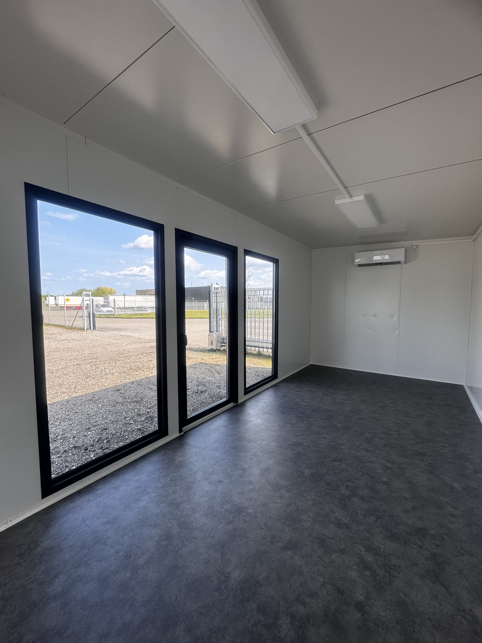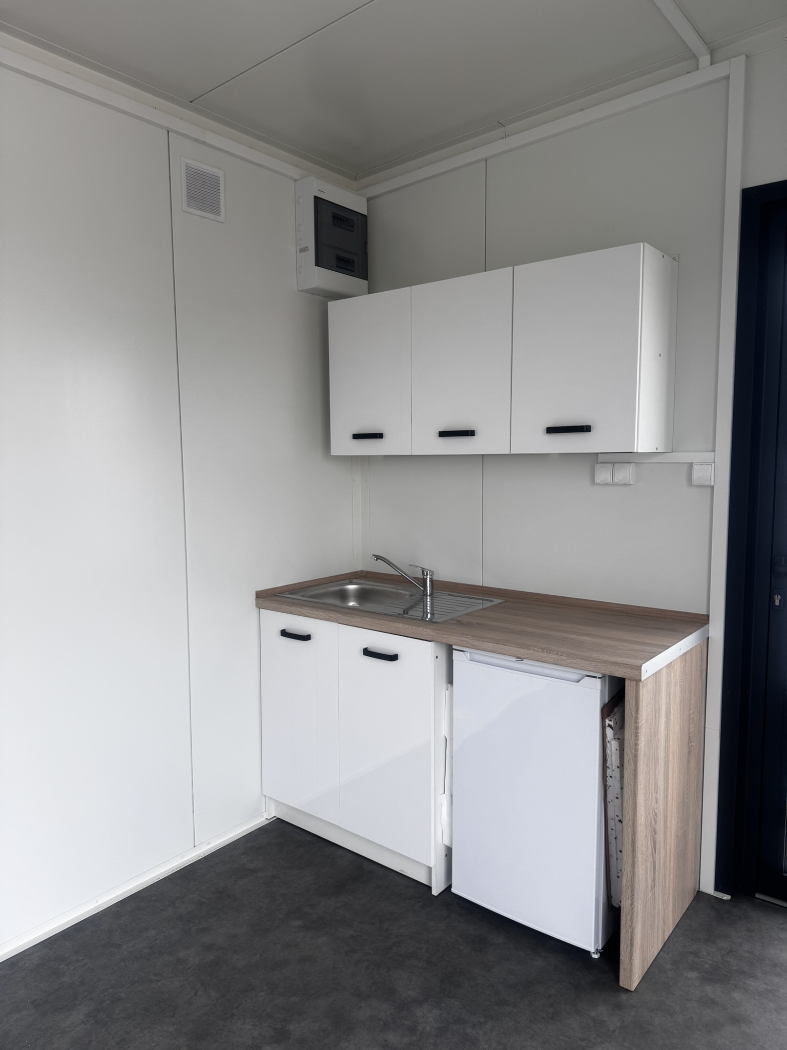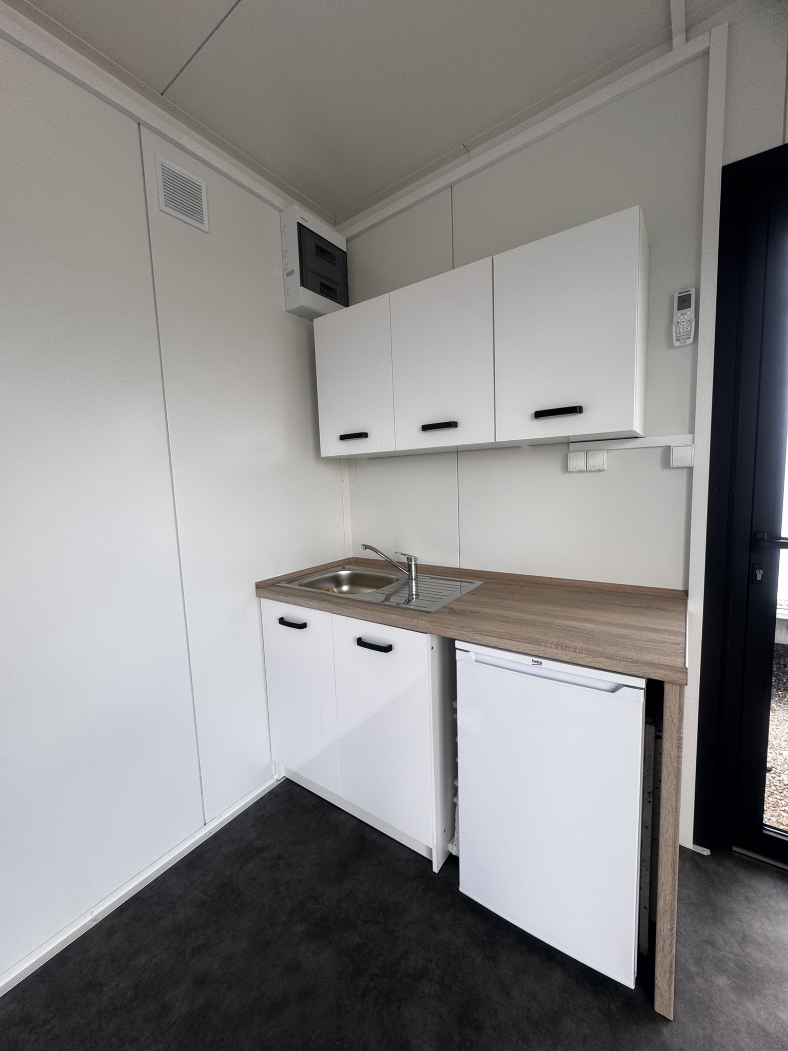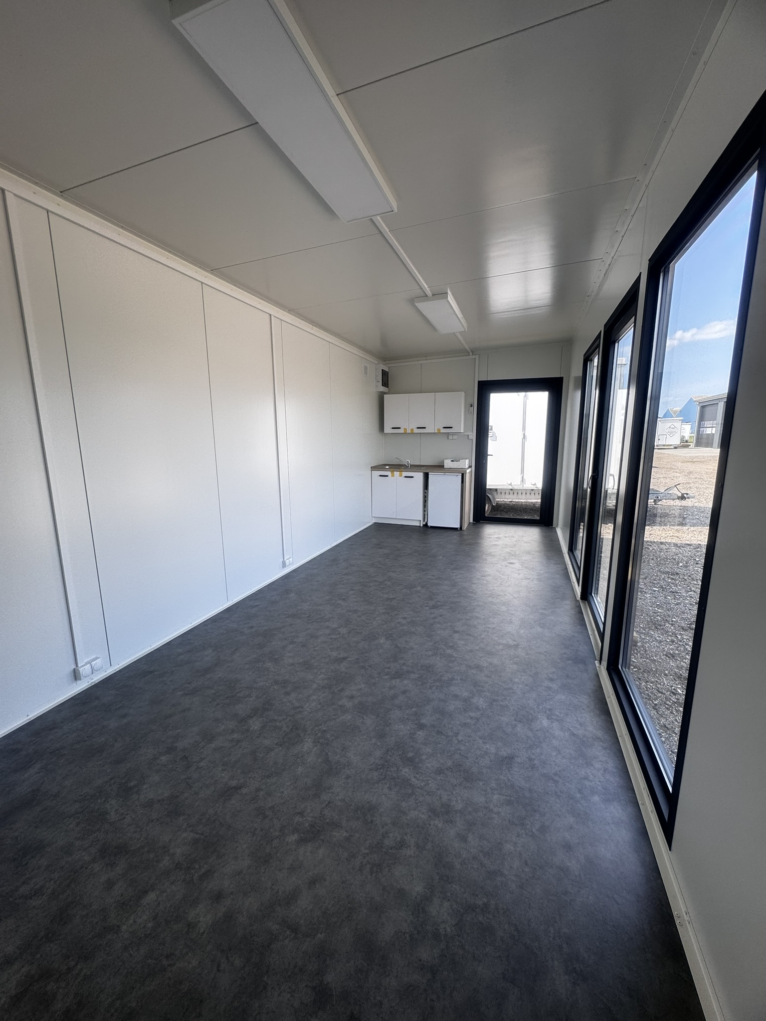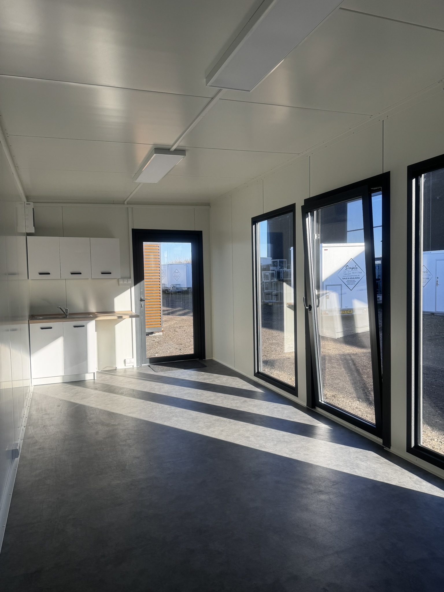 Indvendigt mødes du af hvide vægge og et moderne vinylgulv i betonlook – en tidløs kombination, der passer ind i de fleste omgivelser og indretninger.