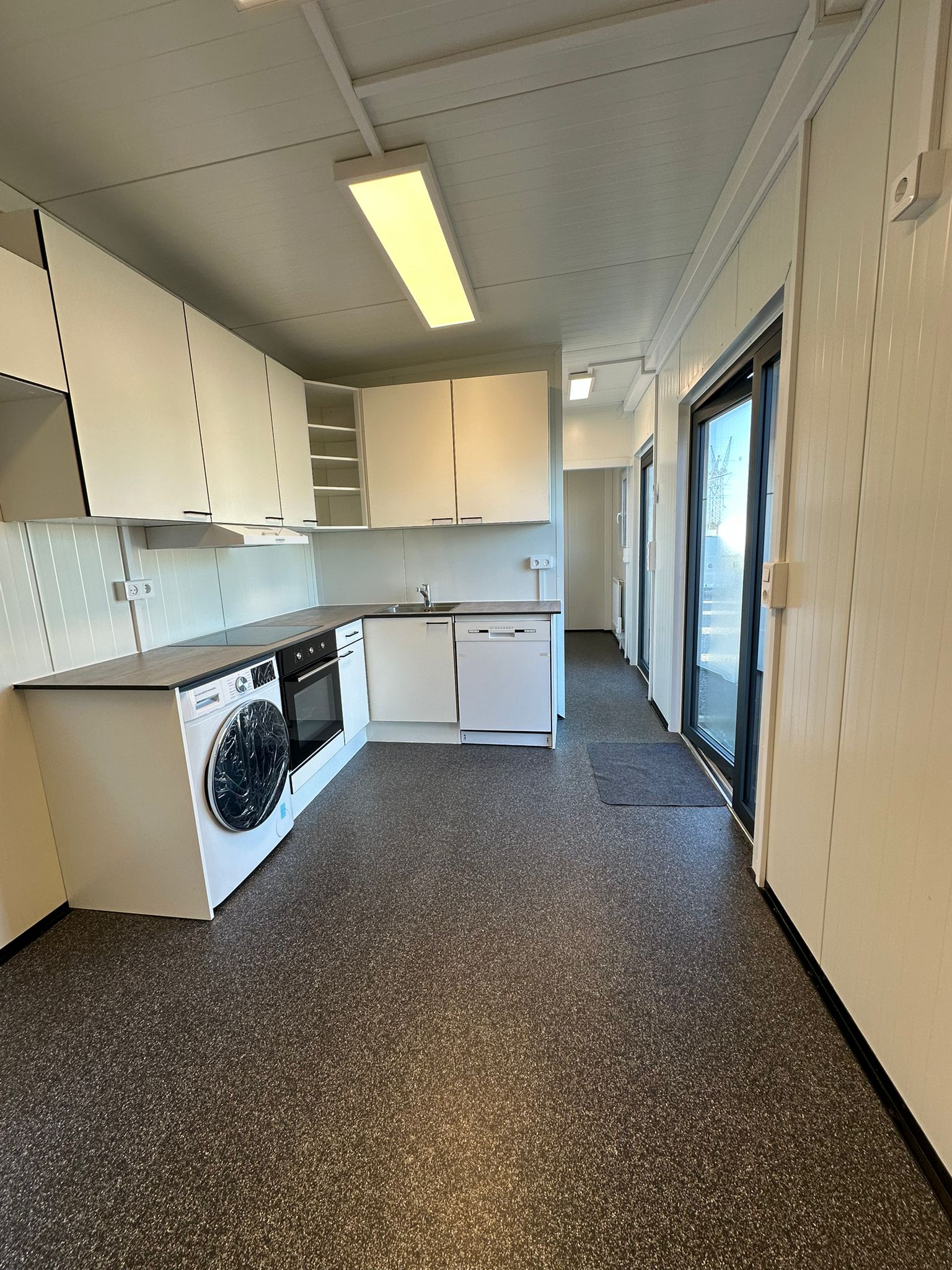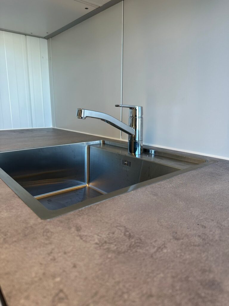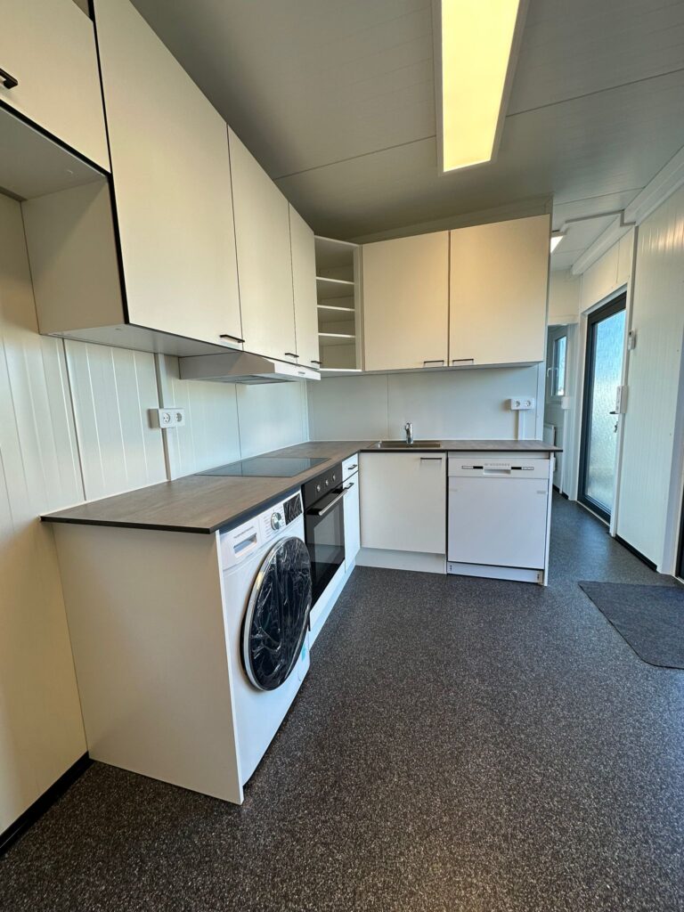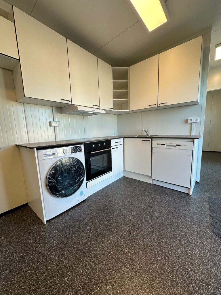 Pavillonen er velegnet som boligløsning og er indrettet med et fuldt udstyret køkken. Køkkenet indeholder blandt andet kombineret vaskemaskine og tørretumbler, ovn, kogeplade, opvaskemaskine og køleskab. Indretningen er gennemtænkt og giver gode muligheder for både opbevaring og praktisk hverdagsbrug.