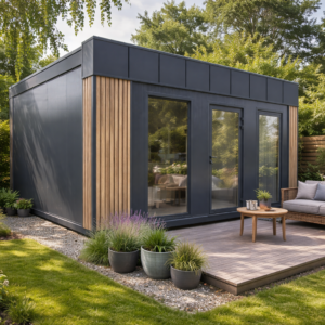 isoleret, monteret med vinduer og dør, udstyret med stikkontakter og belysning klar til tilkobling til strøm og ikke mindst, afsluttet med pænt udvendig look, tilpasset omgivelserne. Du kan derfor tage pavillonen i brug samme dag, den bliver leveret.